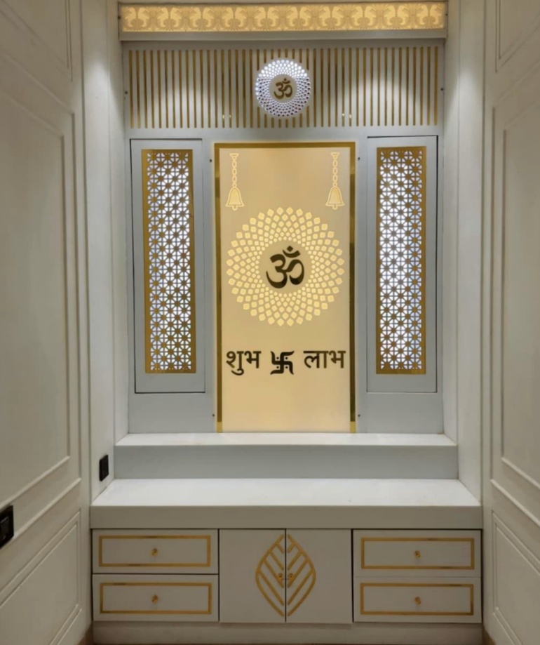 Elevate your spiritual sanctuaries with our Creative Corian Temples, Corian Mandir designer in Lucknow. We seamlessly blend contemporary aesthetics with traditional reverence to create exquisite, custom-designed temples. Our temples are not just places of worship but also fine pieces of art, meticulously crafted to cater to your spiritual needs while adding elegance to your home, Pooja Room Design in Lucknow.